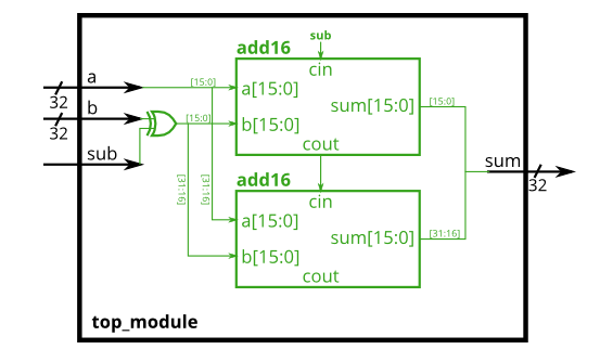 要实现一个32位的加减器,加减由变量sub来决定,sub为0时,实现add,否则,实现sub。