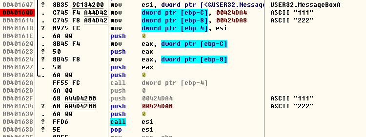 第一行是我的::MessageBox函数指针,到call dword ptr [ebp-4]用了9行...用了29个字节,mov-mov-mov-push-mov-push-mov-push-push,好花啊,而直接使用函数调用API(后那个call esi,esi在上面就是mov esi,dword ptr [<&USER32.MessageBoxA>],函数指针嘛),4个连续的push外加一个call则只用了14个字节,my god!!!!!C内联asm反而效率低?还是编译器不对这些代码进行优化?成为传说中的“花指令”?