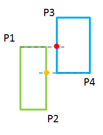 下图给出了不相交时的示例,两矩形为上下关系,可见红点不在橙色点左上角,不能构成矩形,因此不相交。