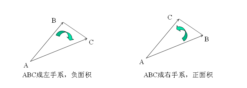在计算几何里,我们知道,△ABC的面积就是“向量AB”和“向量AC”两个向量叉积的绝对值的一半。其正负表示三角形顶点是在右手系还是左手系。