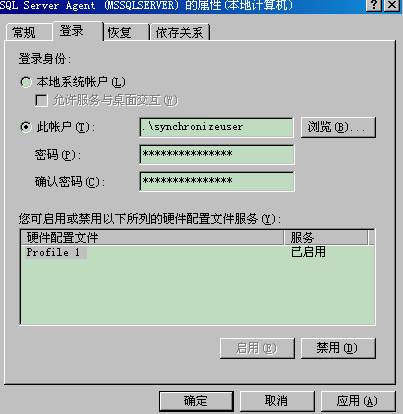 二、 在发布服务器、订阅服务器的 管理工具-服务中右键SQL Server Agent (MSSQLSERVER) 在登录选项卡中,设置用户为指定帐户,密码为设置的密码