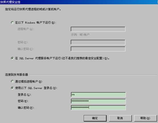 (3)在代理安全性界面,单击 安全设置 按钮,指定将运行快照代理进程的域或计算机帐户,选择"在sqlserver代理服务帐户下运行(这不是我们推荐的最佳安全配置)"