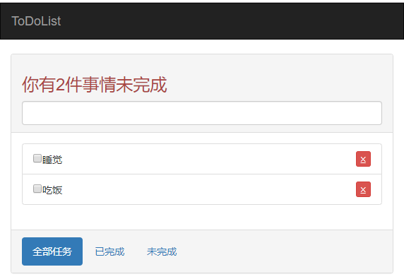 <!--todo.html--> <!-- <!DOCTYPE html> --> <html> <head> <title></title> <meta charset="utf-8"> <link rel="stylesheet" href="node_modulesbootstrapdistcssbootstrap.css"> <style> .del{ text-decoration: line-through; color: #cccccc!important; } </style> </head> <body> <div id="app"> <nav class="navbar navbar-inverse"> <div class="container-fluid"> <div class="navbar-header"> <a class="navbar-brand" href="#"> ToDoList </a> </div> </div> </nav> <div class="container"> <div class="row"> <div class="col-md-8 col-md-offset-2"> <div class="panel panel-default"> <div class="panel-heading"><h3 class="text-danger">你有{{count}}件事情未完成</h3> <input type="text" class="form-control" v-model="title"@keyup.13="add"> </div> <div class="panel-body"> <ul class="list-group"> <li class="list-group-item" v-for="(todo,index) in todos" @dblclick="remenber(todo)"> <div :class="{del:todo.isSelected}" style="display:inline-block;" v-show="cur!==todo"> <input type="checkbox" v-model="todo.isSelected">{{todo.title}} </div> <!-- 动态绑定样式 --> <input type="text" v-model="todo.title" v-show="cur===todo" @blur="leave" v-focus="cur===todo"> <button class="pull-right btn btn-xs btn-danger"@click="remove(todo)">⨱</button> </li> </ul> </div> <div class="panel-footer"> <ul class="nav nav-pills"> <li role="presentation" class="active"><a href="#">全部任务</a></li> <li role="presentation"><a href="#">已完成</a></li> <li role="presentation"><a href="#">未完成</a></li> </ul> </div> </div> </div> </div> </div> </div> </body> <script src="node_modulesaxiosdistaxios.js"></script> <script src="node_modulesvuedistvue.js"></script> <script src="todo.js"></script> </html>