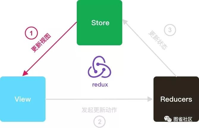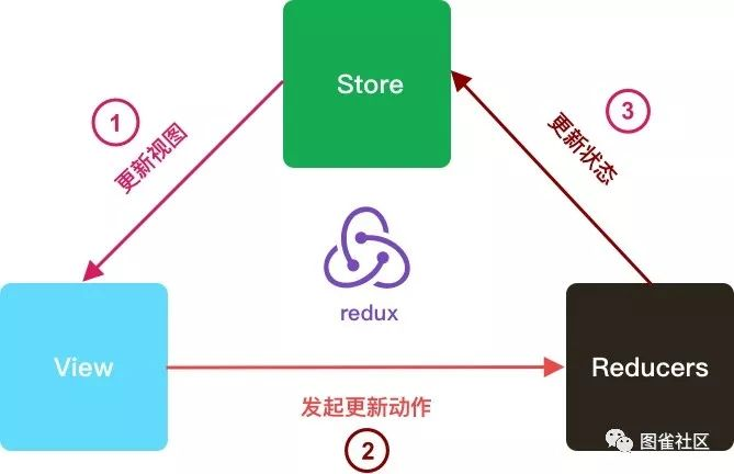 当了解了 Redux 三大概念:Store,Action,Reducers 之后,我们再来看一张图: