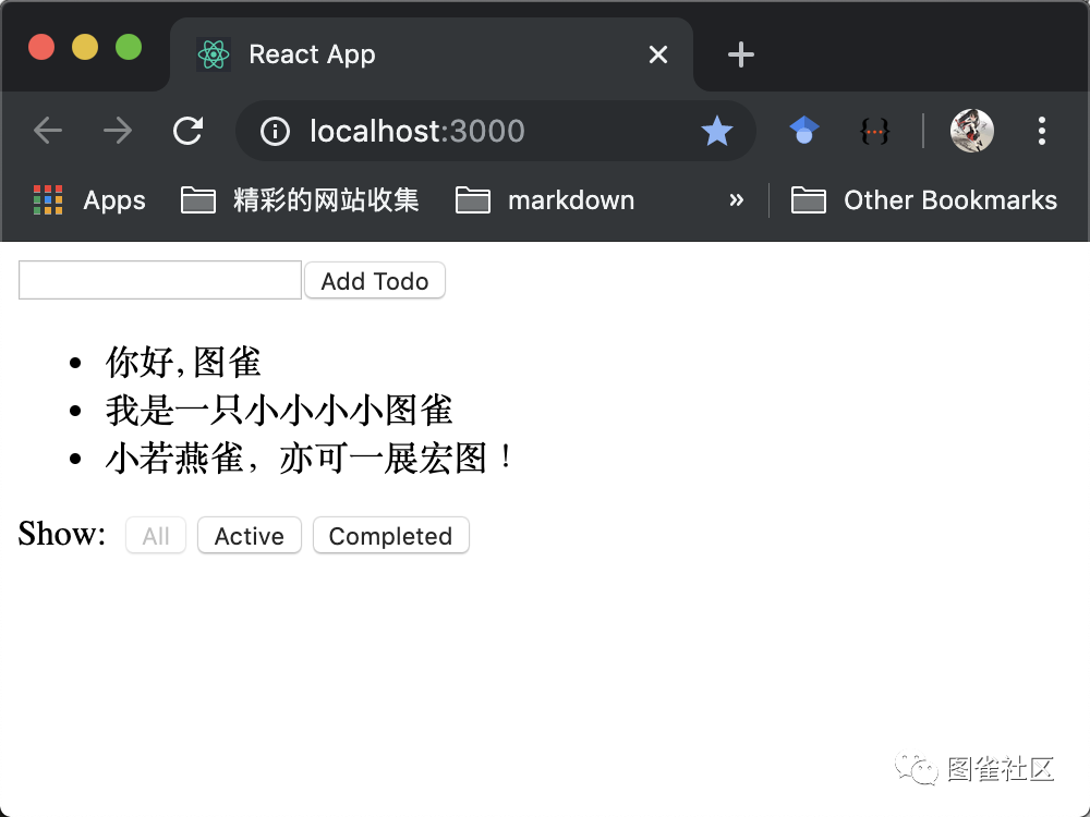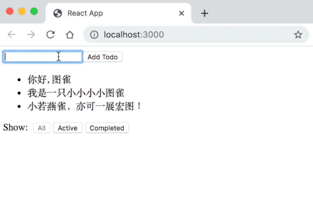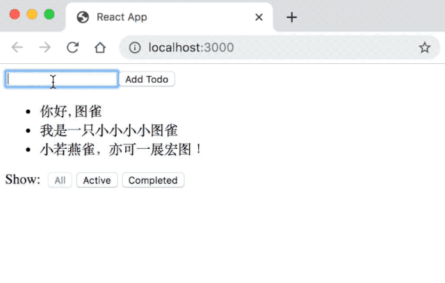 我们希望展示一个 todo 列表,当一个 todo 被点击时,它将被加上删除线表示此 todo 已经完成,我们还加上了一个输入框,使得用户可以增加新的 todo。在底部,我们展示了三个按钮,可以切换展示 todo 的类型。