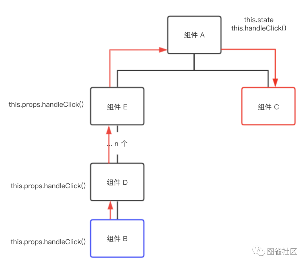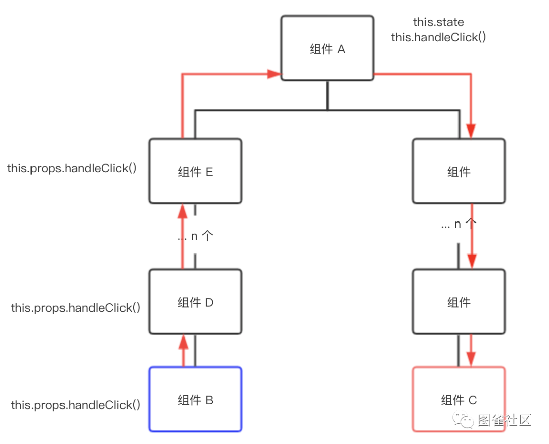我们看到上面这张图,组件 B 和组件 C 相差了很多级,图中的 n 可能为 10,也可能更多。这个时候如果再想在组件 B 中修改组件 C,那就要把这个 handleClick 方法一层一层地往下传。每次要修改的时候,都要进行调用,这已经相当繁琐了。
