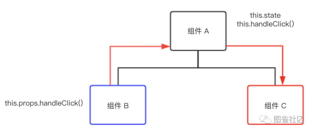 组件 A 是组件 B 和 C 的父组件。如果组件 B 想要操作组件 C,那么它首先需要调用父组件 A 传给它的 handleClick 方法,然后通过这个方法修改父组件A的 state,进而通过 React 的自动重新渲染机制,触发组件 C 的变化。