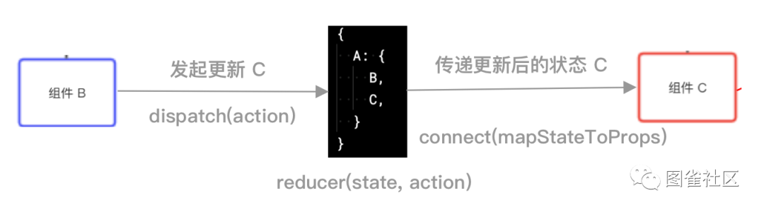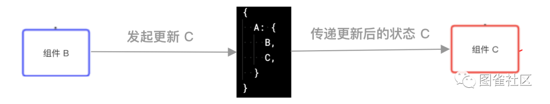 我们在组件 B 中发起一个更新状态 C 的动作,此动作对应的更新函数更新 Store 状态树,之后将更新后的状态 C 传递给组件 C,触发组件 C 的重新渲染。