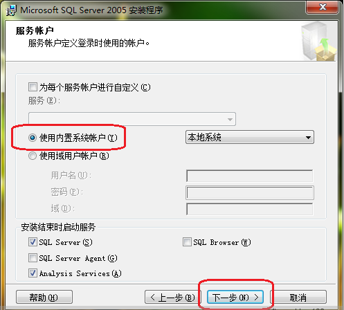 选择“使用内置系统账户”,然后一直点击下一步: