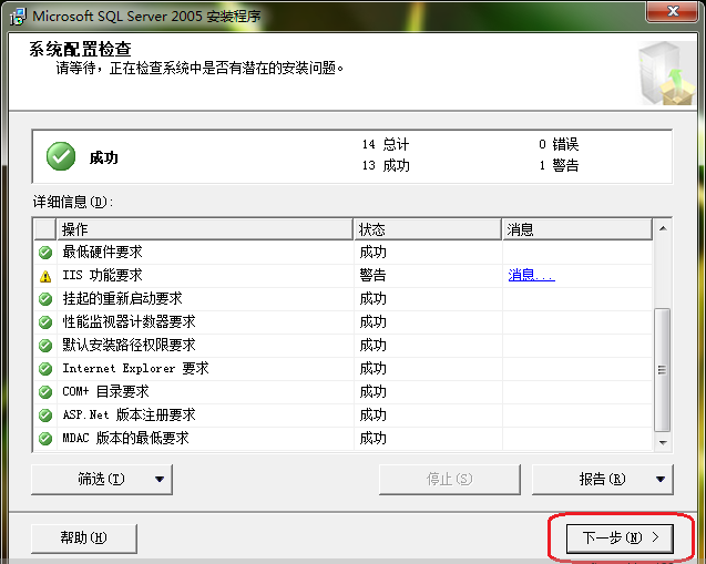 等待检查完成后,点击“下一步”(注意:如果此处有错误的话,就需要先把错误解决了才能继续下面的安装,否则的话可能会导致后面的安装失败,那个IIS功能要求可以不用管):