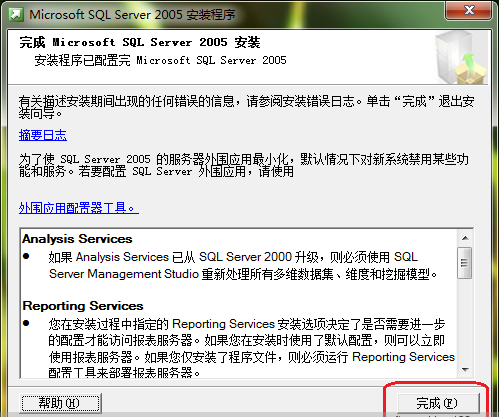 点击“完成”,这样SQL Server 2005就安装好了:
