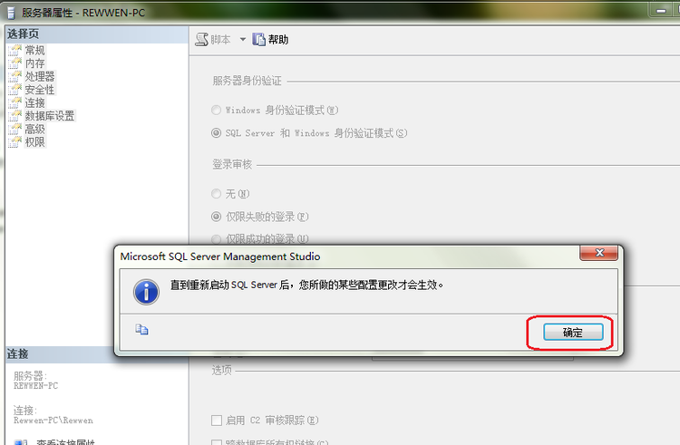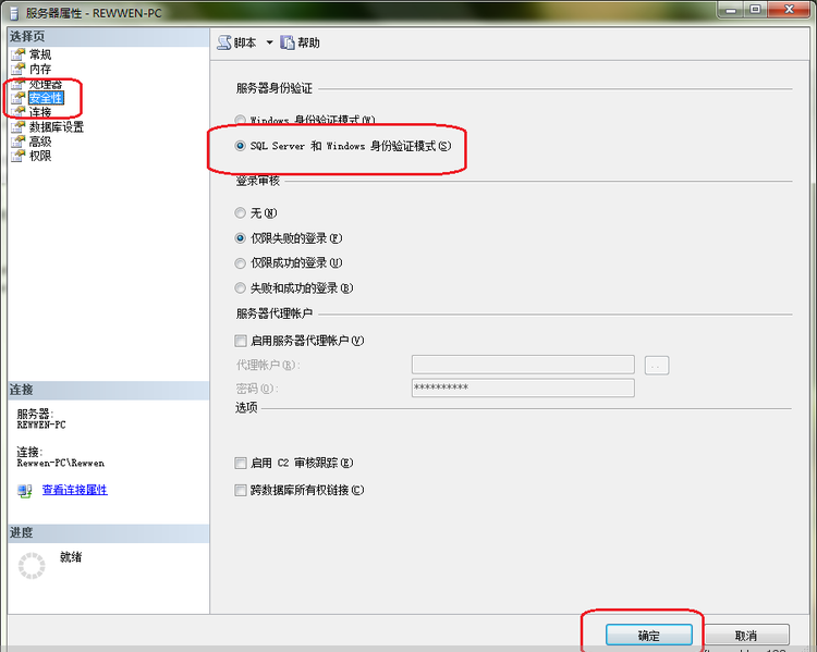在打开的窗体里面点击左边的“安全性”选项,然后在右边选中“SQL Server 和 Windows 身份验证模式”,然后点击确定按钮: