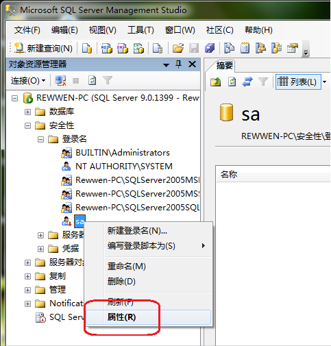 然后依次展开左边的树形框,在安全性——登录名——sa那里右键点击,选择“属性”: