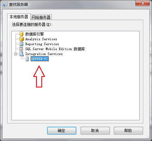 然后在打开的“查找服务器”窗体里面,展开最后一项“Integration Services”,就可以看到一个服务器名称,选中它,然后点击“确定”按钮,如图所示: