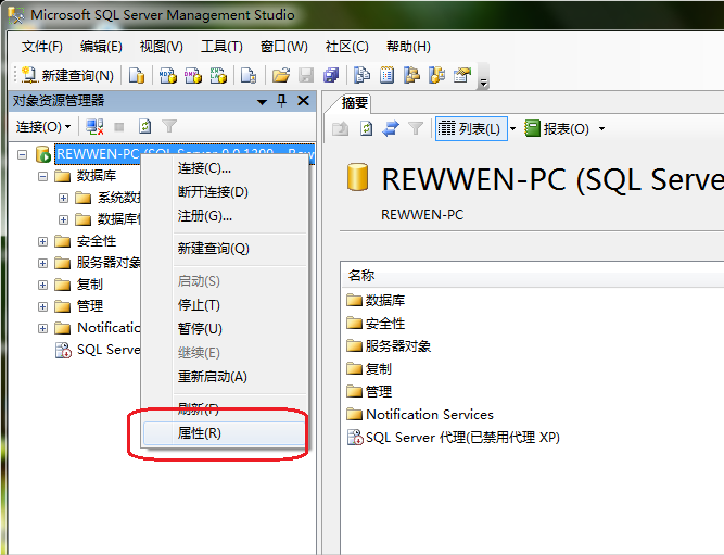 然后在左边树形框服务器名称那里右键点击,选择“属性”:
