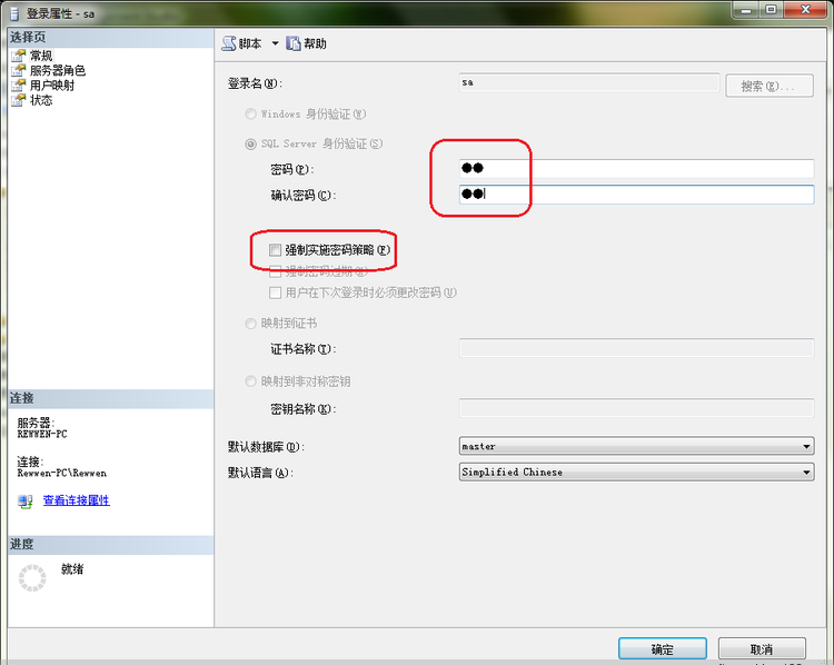 在打开的窗体当中将“强制实施密码策略”前面的钩去掉,并且输入密码和确认密码均为sa(也可以指定更加复杂的密码),如图所示: