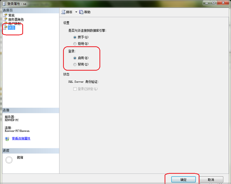 然后点击左上角的“状态”选项,在“登录”那里选择“启用”,然后点击“确定”按钮,如图所示: