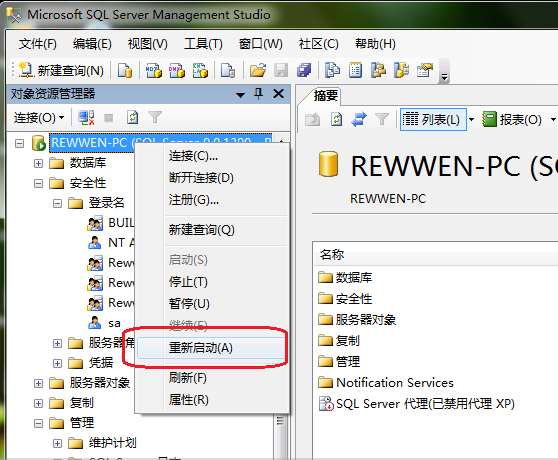 然后右键点击服务器名称那里,选择“重新启动”,这样就完成了SQL Server 2005的配置:
