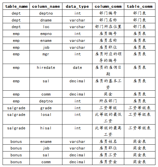需求:查询出给定的表dept,emp,bonus,salgrade里的表名,字段名、字段类型、字段注释、表注释信息。