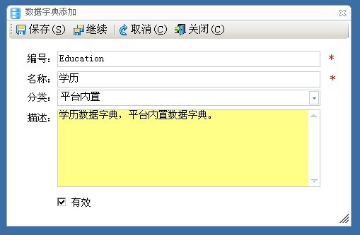 根据开发的需要,我们可以添加所需的数据字典项。添加数据字典如图5.1.2所示,在添加时需要注意的是编号与名称在同一分类下不能与已有的数据重复。注意,这儿有一个分类项,主要用于对数据字典进行分类,我们一般建议按各个子系统对数据字典进行分类,这样更方便管理。