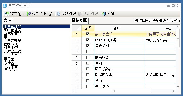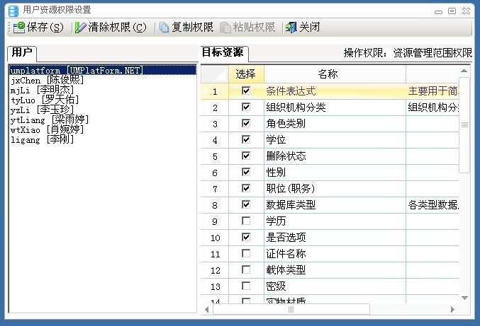 给相应的用户授予相应的字典项的管理权限,对数据字典这样的基础数据的管理尤为重要,其用处与重要性在上面我们已经阐述得很清楚,现在我们来看看如何给相应的用户授予相应的字典项管理权限。在这儿我们称其为资源管理权限,字典项就是一种资源,用于拥有该资源,就表示给用户授予了此资源管理权限。用户资源权限设置如图5.1.4所示。