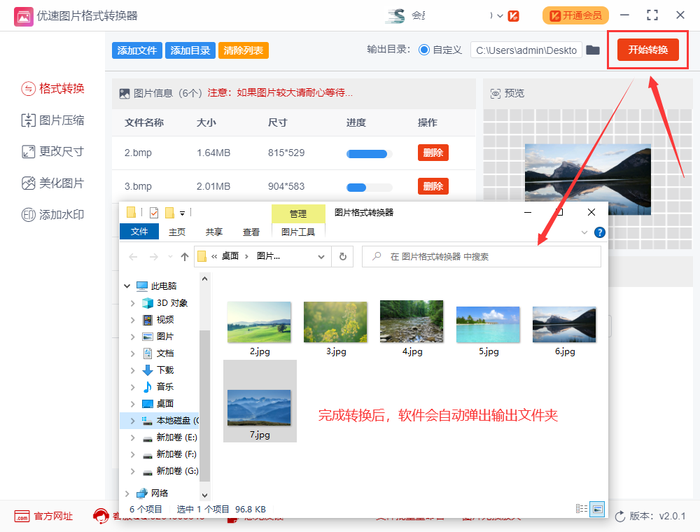 步骤3,先选择输出目录文件夹,用来保存转换后的图片;之后就可以点击右上角红色按钮启动格式转换了,完成转换后软件会自动弹出输出文件夹,方便我们及时查看转成的jpg图片。