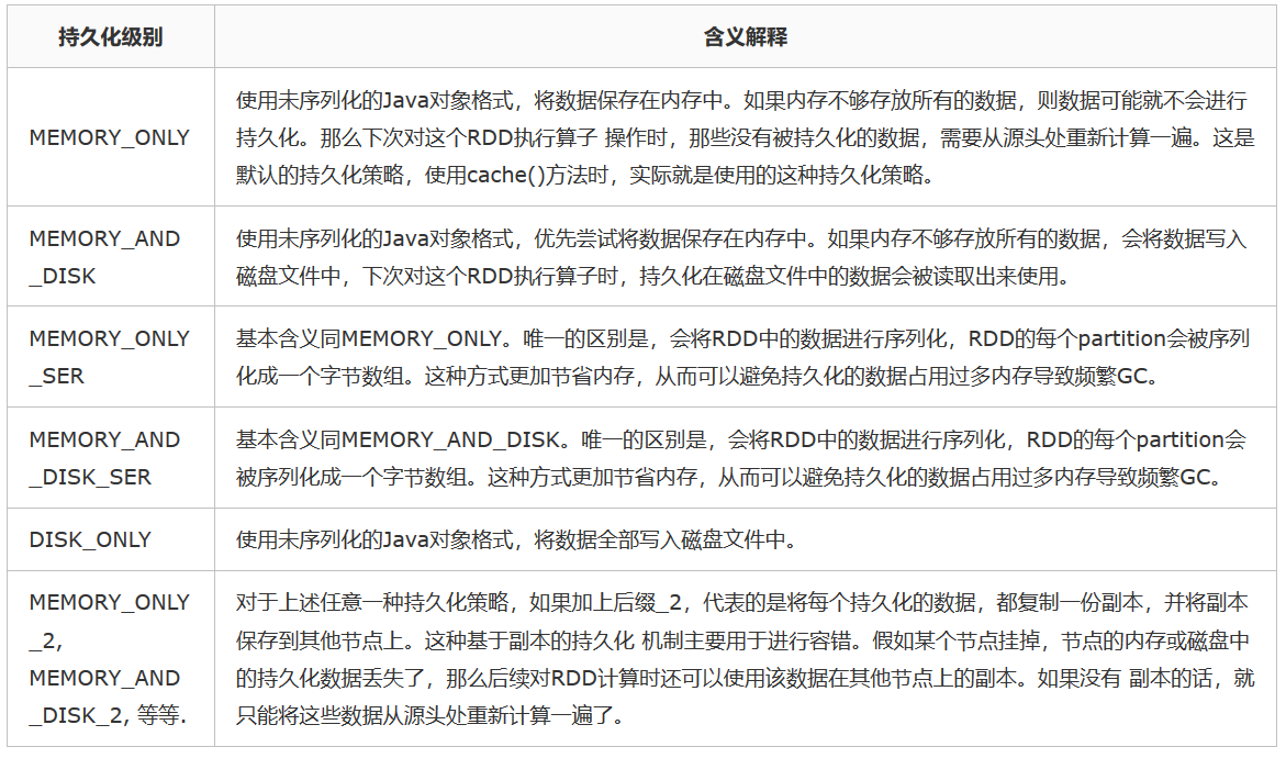 - 通常不建议使用DISK_ONLY和后缀为_2的级别:因为完全基于磁盘文件进行数据的读写,会导致性能急剧降低,有时还不如重新计算一次 所有RDD。后缀为_2的级别,必须将所有数据都复制一份副本,并发送到其他节点上,数据复制以及网络传输会导致较大的性能开销,除非是要求作业的高可用 性,否则不建议使用。