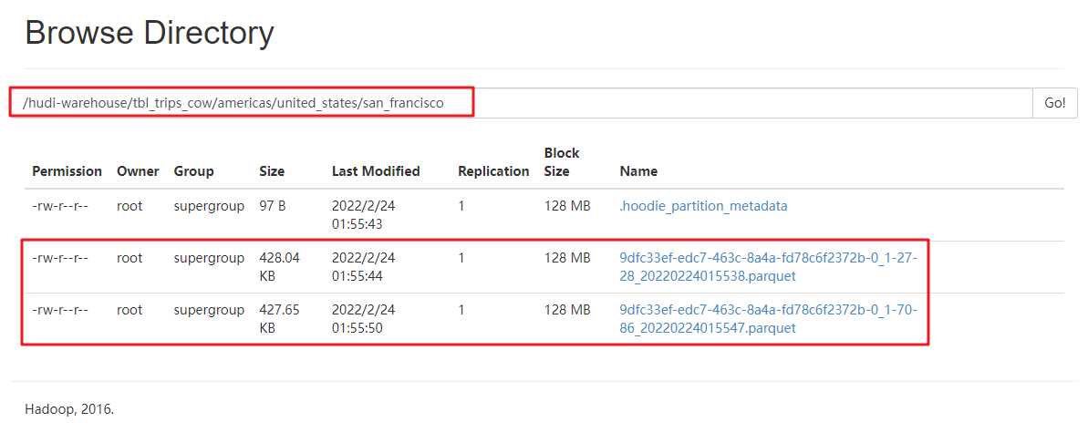 同时,因为这是用的cow表类型,所以可以在hdfs文件系统中看到2个parquet文件,如下图所示: