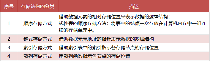 存储结构可分为: 顺序存储结构、 链式存储结构、 索引存储方式 和 散列存储方式 等。