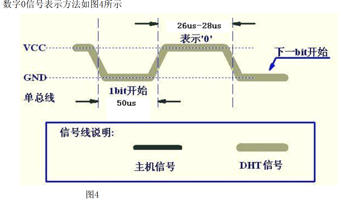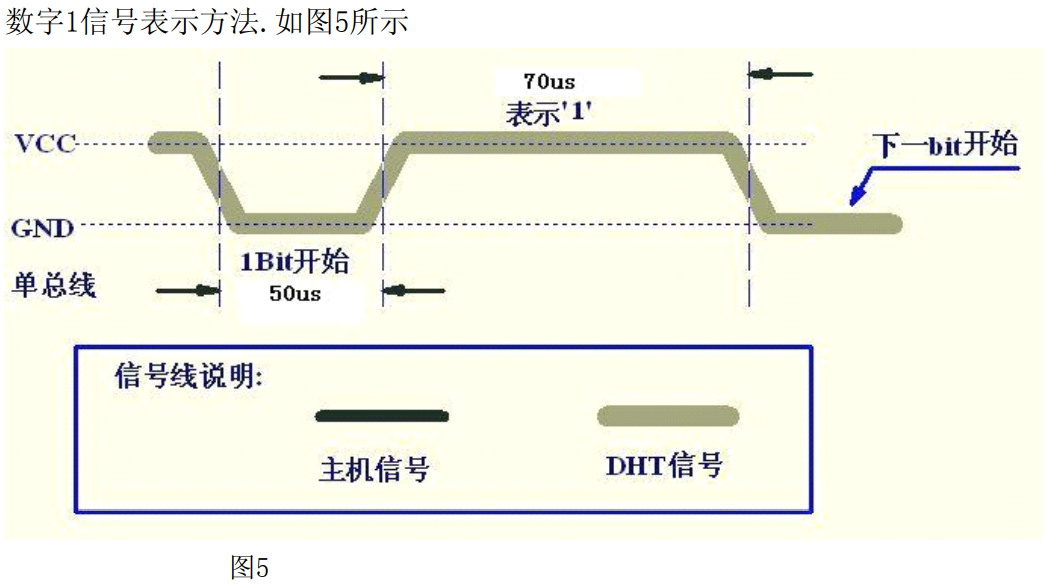 因为温湿度数据由四个8bit的数据构成,那我们就读每8位读一次,总共读5次,最后一次获取的是校验和。从上图我们可以看出不管是0信号还是1信号都有低电平+高电平表示,而且低电平持续时间相同,都是50us,那么就要求我们从高电平持续的时间来判断0/1信号。