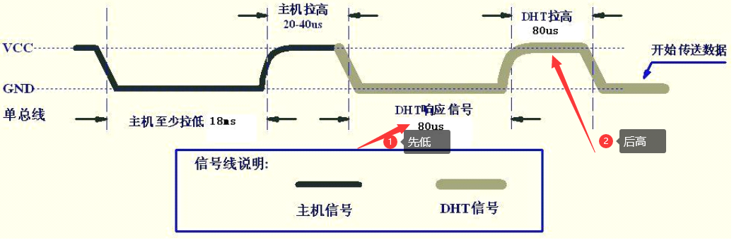 那要怎样发送开始信号才能让DHT11模块知道该把数据送到单片机呢?主要分下面几步即可完成开始信号的发送: