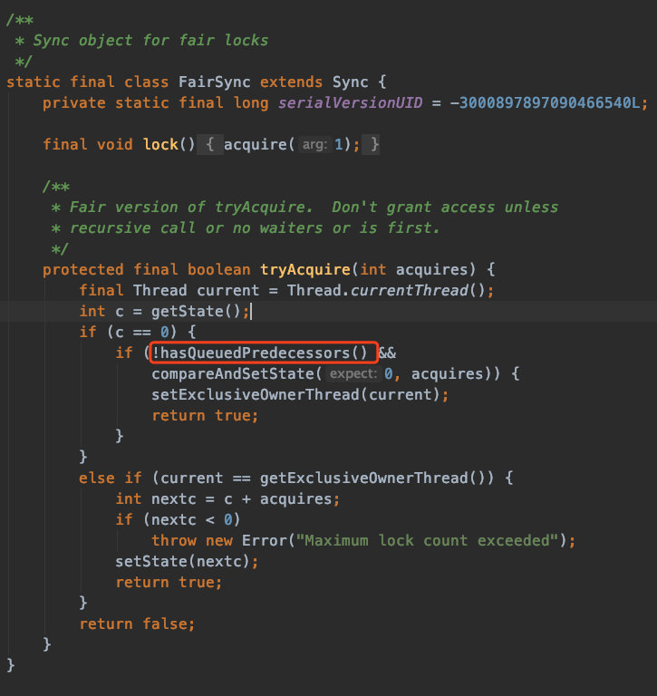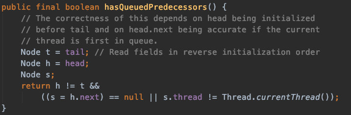 你可以看到,他加了一个hasQueuedPredecessors的判断,那他判断里面有些什么玩意呢?