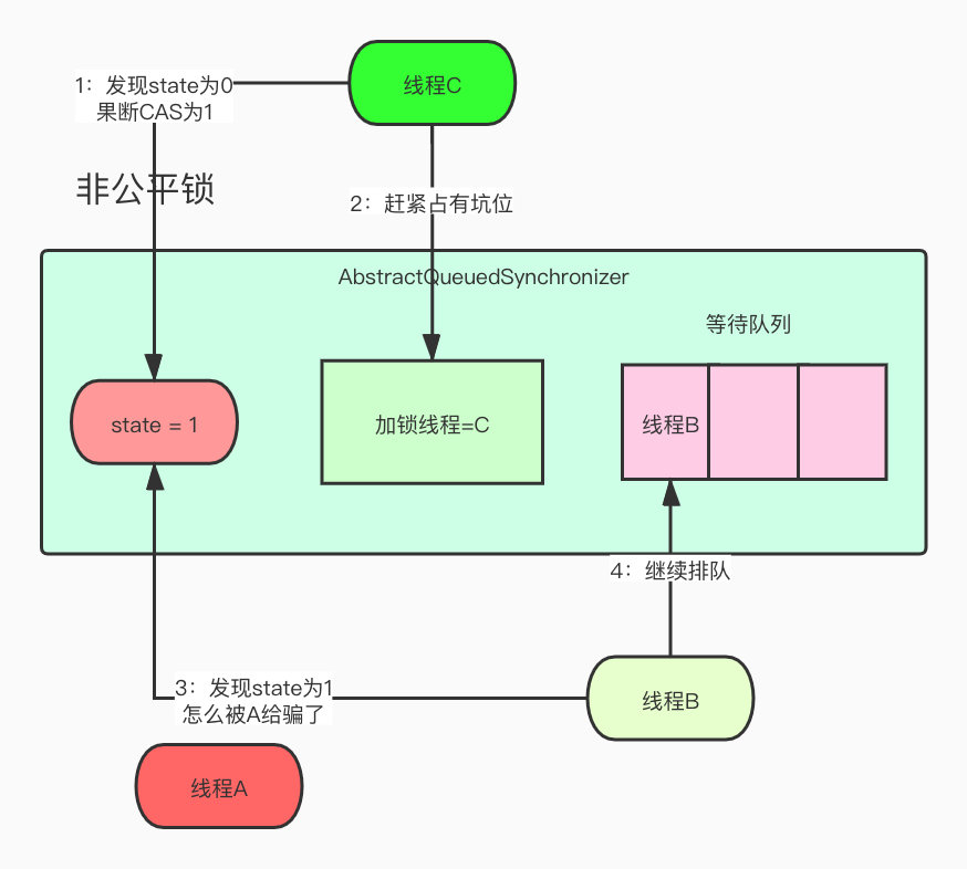 线程A暖男来了,持有没多久就释放了,改掉了所有的状态就去唤醒线程B了,这个时候线程C进来了,但是他先判断了下state发现是0,以为有戏,然后去看了看队列,发现前面有人了,作为新时代的良好市民,果断排队去了。
