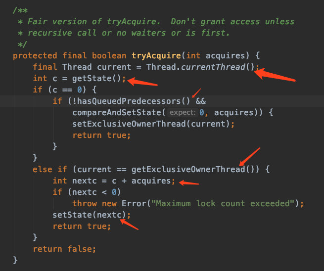 总结我不说话了,但是去获取锁判断的源码,箭头所指的位置,现在是不是都被我合理的解释了,当前线程,state,是否是0,是否是当前线程等等,都去思考下。