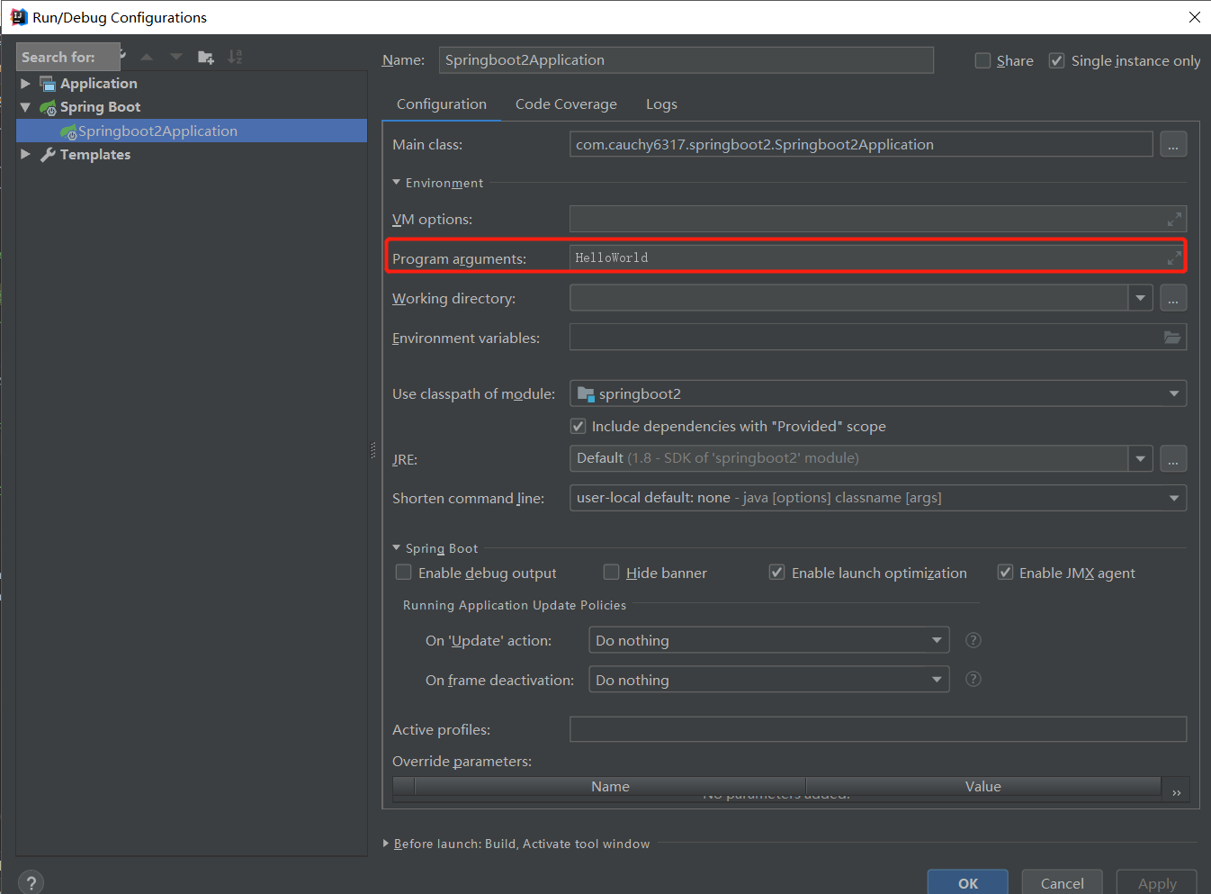 好了,大功告成!启动你的程序,可以看到控制台打印出了"Hello CommandLineRunner!"。现在让我们再来看看,String... args参数该如何使用。这个可变参数就是启动类中的String[] args,也就是我们传入启动类的参数可以直接在该方法中使用。那么该如何向启动类的main方法传入参数呢?在Intellij IDEA中我们可以这样做,点击菜单栏Run->Edit Configurations->Environment(默认为 collapse all),在Program arguments中输入你想设置的数组。然后在CommandLineRunnerStudy的run方法中添加"System.out.println(args[0]);"就可以打印出来了。
