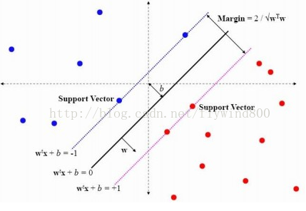 上图显示的是一个二维“线性可分”的情况,图中的那条黑线就是“超平面”,由此决定的两条虚线间的距离最大,而虚线上的2个蓝色点、2个红色点决定了超平面位置,他们被叫做“支持向量” support vector.
