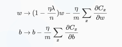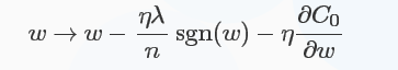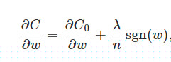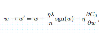 比原始的更新规则多出了η * λ * sgn(w)/n这一项。当w为正时,更新后的w变小。当w为负时,更新后的w变大——因此它的效果就是让w往0靠,使网络中的权重尽可能为0,也就相当于减小了网络复杂度,防止过拟合。