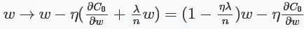 对于L2正则化:C=C0+λ2n∑iω2iC=C0+λ2n∑iωi2,相比于未加正则化之前,权重的偏导多了一项λnωλnω,偏置的偏导没变化,那么在梯度下降时ωω的更新变为: