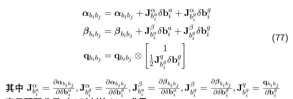 由于更新bias会导致预积分量也发生变化,而重新积分非常复杂,所以对于预积分量直接在i时刻的bias附近用一阶泰勒展开来近似,而不用真的迭代计算。