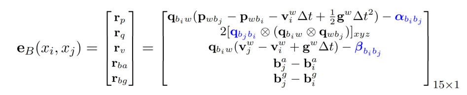 residuals.block<3, 1>(O_P, 0) = Qi.inverse() * (0.5 * G * sum_dt * sum_dt + Pj - Pi - Vi * sum_dt) - corrected_delta_p;