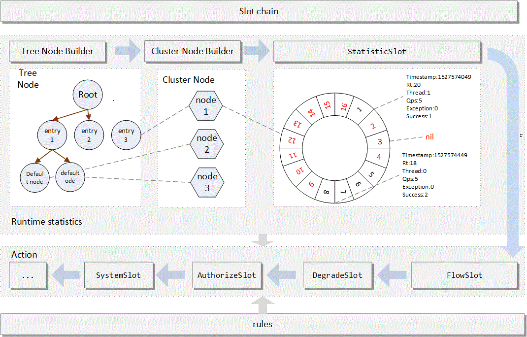 NodeSelectorSlot负责收集资源的路径,并将这些资源的调用路径,以树状结构存储起来,用于根据调用路径来限流降级;ClusterBuilderSlot则用于存储资源的统计信息以及调用者信息,例如该资源的 RT, QPS, thread count 等等,这些信息将用作为多维度限流,降级的依据;StatisticSlot则用于记录、统计不同纬度的 runtime 指标监控信息;FlowSlot则用于根据预设的限流规则以及前面 slot 统计的状态,来进行流量控制;AuthoritySlot则根据配置的黑白名单和调用来源信息,来做黑白名单控制;DegradeSlot则通过统计信息以及预设的规则,来做熔断降级;SystemSlot则通过系统的状态,例如 load1 等,来控制总的入口流量;