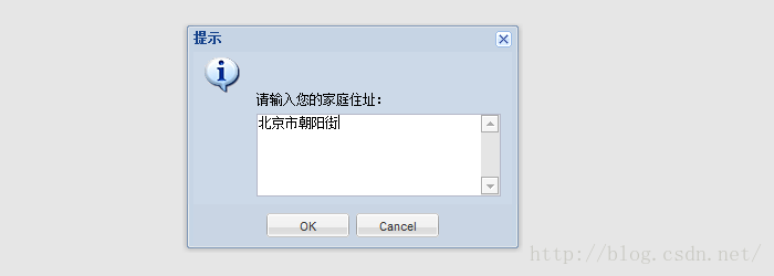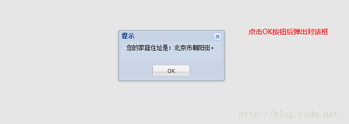 Ext.Msg.alert("提示","您的家庭住址是:"+text+"。");