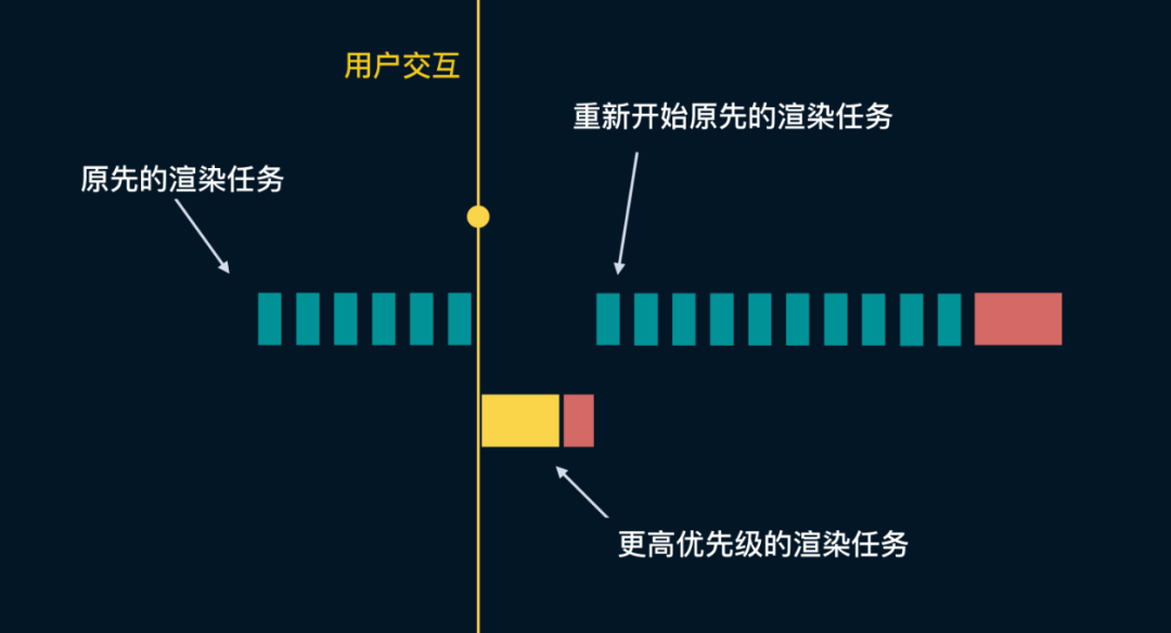当渲染任务遭遇到更高级的渲染任务时将会被中断,然后优先执行优先级更高的任务,再任务完成之后,再回到原来的渲染任务上。