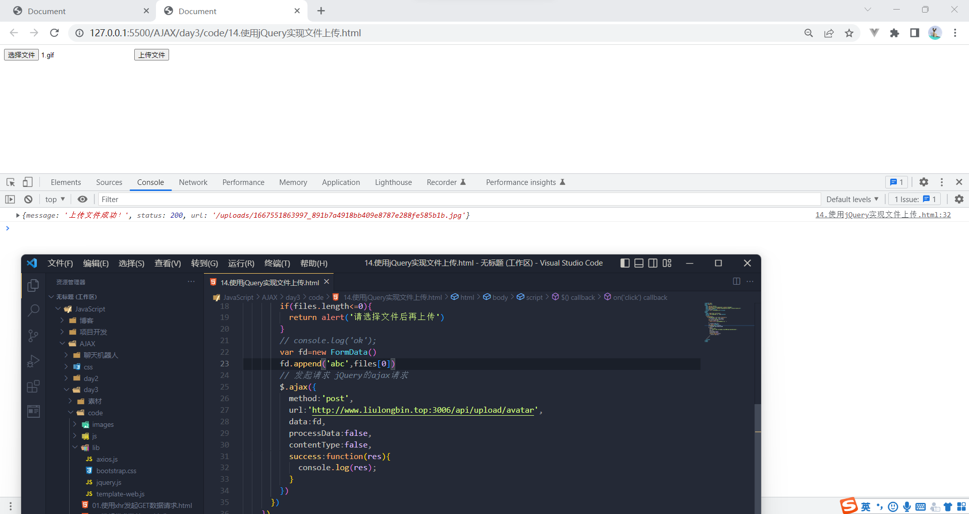 以上就是聪明蜻蜓最近收集整理的关于Ajax--Ajax加强--jQuery高级用法(用jQuery实现文件上传功能)的全部内容,更多相关Ajax--Ajax加强--jQuery高级用法(用jQuery实现文件上传功能)内容请搜索靠谱客的其他文章。