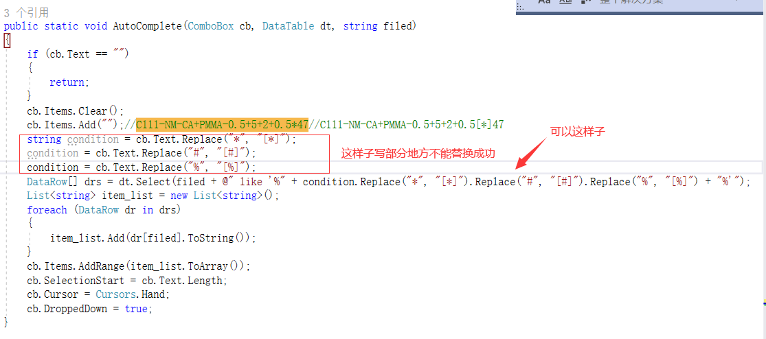 public static void AutoComplete(ComboBox cb, DataTable dt, string filed) { if (cb.Text == "") { return; } cb.Items.Clear(); cb.Items.Add("");//C111-NM-CA+PMMA-0.5+5+2+0.5*47//C111-NM-CA+PMMA-0.5+5+2+0.5[*]47 string condition = cb.Text.Replace("*", "[*]"); condition = cb.Text.Replace("#", "[#]"); condition = cb.Text.Replace("%", "[%]"); DataRow[] drs = dt.Select(filed + @" like '%" + condition.Replace("*", "[*]").Replace("#", "[#]").Replace("%", "[%]") + "%'"); List<string> item_list = new List<string>(); foreach (DataRow dr in drs) { item_list.Add(dr[filed].ToString()); } cb.Items.AddRange(item_list.ToArray()); cb.SelectionStart = cb.Text.Length; cb.Cursor = Cursors.Hand; cb.DroppedDown = true; }