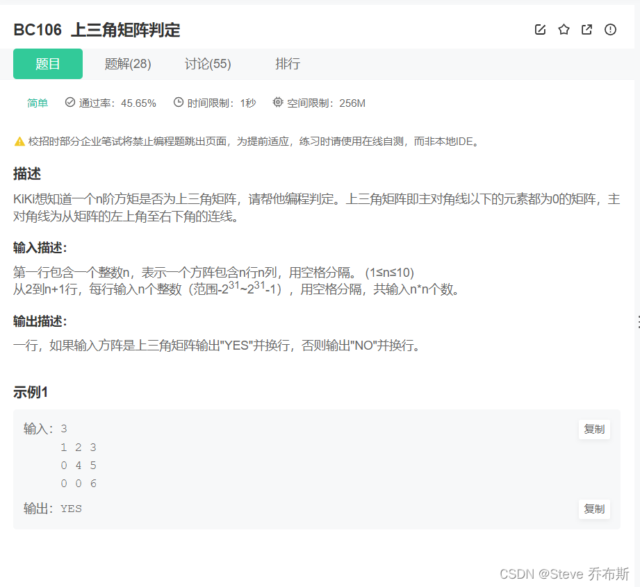 KiKi想知道一个n阶方矩是否为上三角矩阵,请帮他编程判定。上三角矩阵即主对角线以下的元素都为0的矩阵,主对角线为从矩阵的左上角至右下角的连线。
