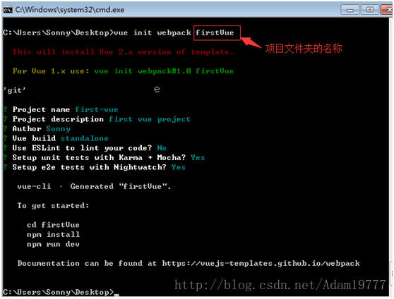 6、在桌面目录下,在命令行中运行命令 vue init webpack firstVue 。解释一下这个命令,这个命令的意思是初始化一个项目,其中webpack是构建工具,也就是整个项目是基于webpack的。其中firstVue是整个项目文件夹的名称。