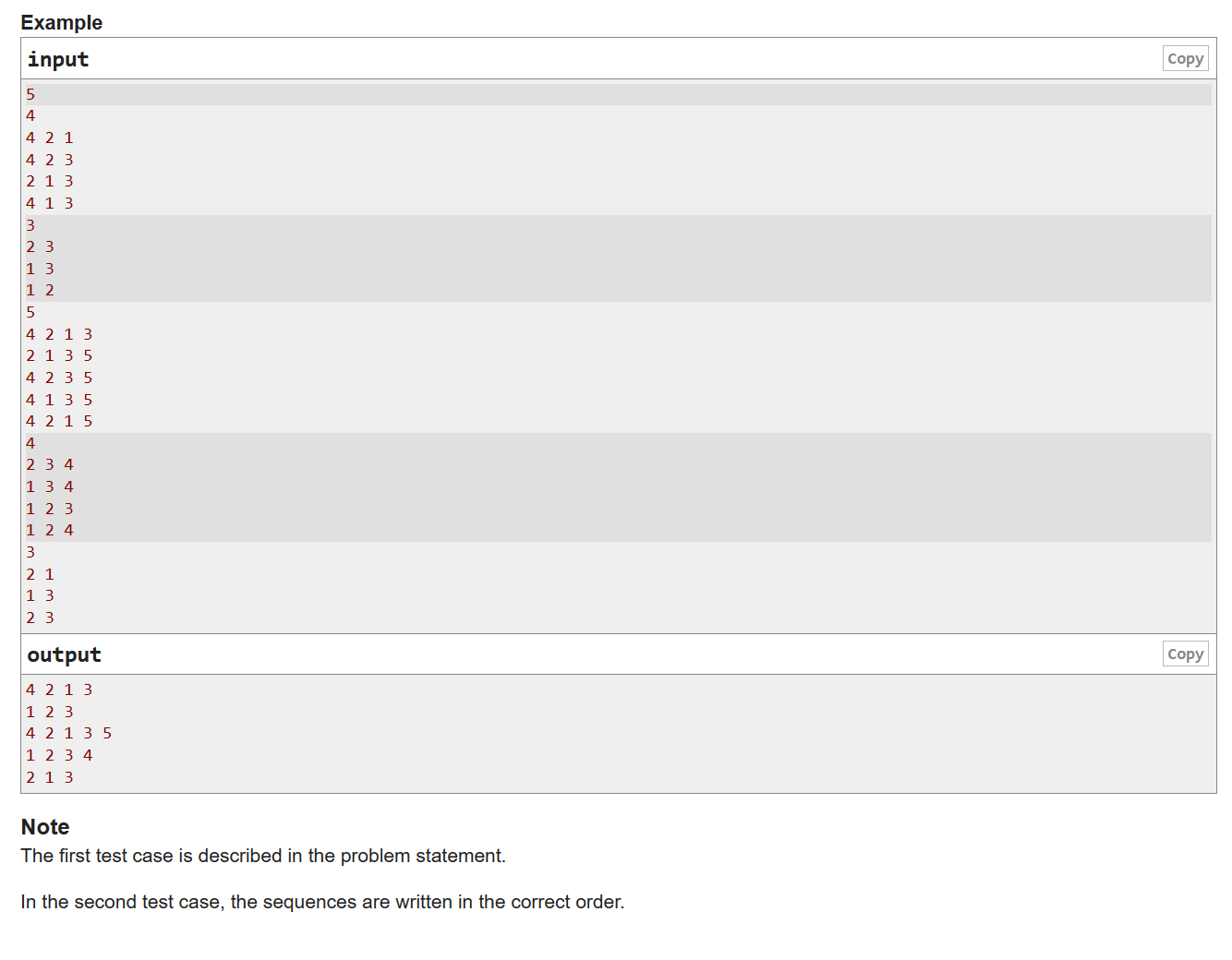 对于每个测试案例,在单独的一行中输出一个排列组合p,使所给的mn个序列可以从它那里得到。