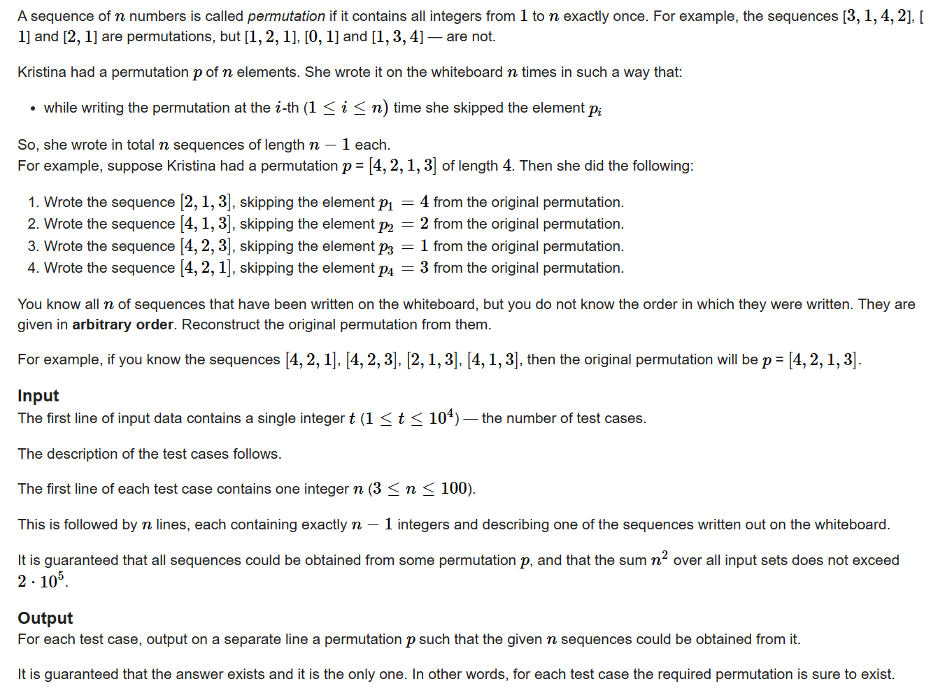 例如,如果你知道序列[4, 2, 1], [4, 2, 3], [2, 1, 3]. [4,1,3],那么原始的排列组合将是p=[4,2,1,3]。
