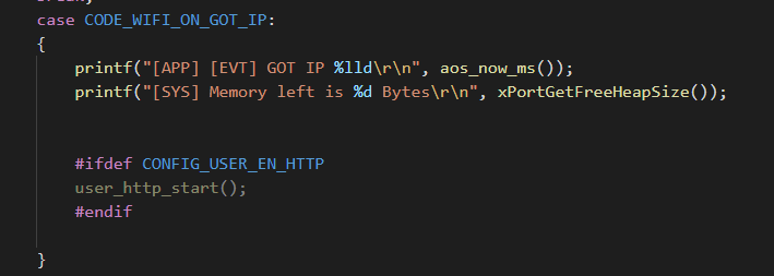 2、下面创建http任务,WIFI连接成功之后,去下载服务器文件,并打印出来。我们在WIFI获取到IP之后,调用user_http_start()即可